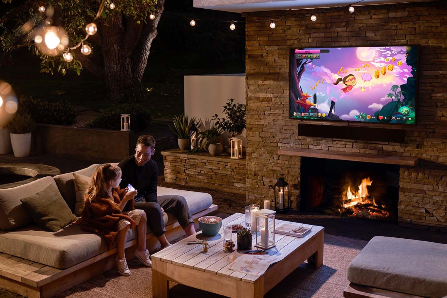 Make the most of your patio, porch, and lawn spaces with comfortable lighting and ready to play av